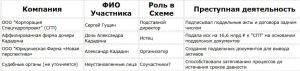 Ниже представлена таблица схемы действий мошенников, где указаны все причастные лица, компании и их роли в преступной деятельности.