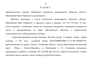 На такие мысли наводит резонансное судебное дело по иску «Ханты-Мансийского банка Открытие» от января 2014 года о взыскании более 100 млн рублей, а также различного движимого и недвижимого имущества — техники, спортивно-развлекательного центра Боулинг-центр, 5-этажного здания по договору займа.