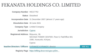 FEKANATA HOLDINGS CO. LIMITED ликвидировано лишь в 2021 году, но директор фирмы — ΚΥΡΙΑΚΟΣ ΚΥΡΙΑΚΟΥ засветился в ряде прочих офшоров, что вполне могут быть связаны с не названными гражданами РФ.