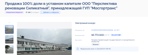 Итоги тендера по продаже 100% доли ООО «Перспектива Реновации Силикатный», что принадлежало Мосгортрансу и было создано в июле 2024 года явно специально под предстоящую распродажу, пока в стадии подведения.