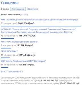 Однако в случае ООО «Концессии водоснабжения» возникают вопросы по тому, а откуда здесь взялись деньги и является ли данный проект частным. У организации 777 заказчиков и 7894 госконтракта, а ведущим контрагентом является МКУ Служба Единого Заказчика-Застройщика Администрации Волгограда с портфелем на сумму в более чем 1 млрд рублей.