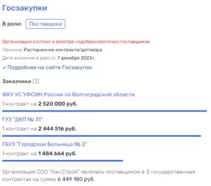 Руководителем ликвидированной ООО «Канстрой» был Владимир Торопов, а сегодня в Волгограде существует ООО «Кан.строй» с руководителем и учредителем Гавриилом Владимировичем Тороповым. Нетрудно догадаться, что это взаимосвязанные люди и структуры, и что главное – у данной организации есть госзакупки на сумму в 6,5 млн рублей, хоть она и состоит в реестре недобросовестных поставщиков. Как местные и региональные власти могут работать с людьми, обладающими таким бэкграундом?