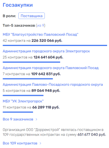 Общая сумма соглашений фирмы перевалила за 651 млн рублей, из которых 226 млн получено именно от МБУ «Благоустройство Павловский Посад». Учитывая, что ООО зарегистрировано лишь в 2019 году, практически все эти контракты пришлись именно на руководство Владимира Секова.
