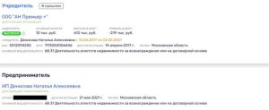 Её тезка — Наталья Денисова на сегодня работает в Подмосковье как ИП в сфере агентств недвижимости. До этого дама была владельцем ООО «АН Премьер +» в Балашихе. В 2021 году она вышла из числа владельцев, оставив доли некой Надежде Астаховой, которой также принадлежит ООО «АН Премьер», ликвидированный в 2017 году.