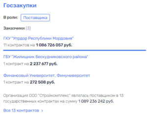 Потом был контракт в 2019 году от ГБУ «Жилищник Бескудниковского района» – тоже московского госучреждения, и далее соглашения посыпались на фирму, как из рога изобилия уже в 2023. И все – от ГКУ «Упрдор Республики Мордовия». «Стройкомплекс» еще не закончил работы, но, считай, готов получить конкретно от этого заказчика сумму, превышающую 1 млрд рублей.