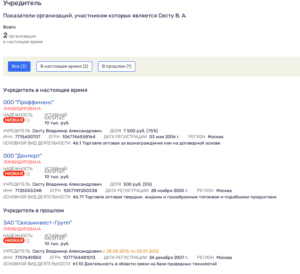 В ЕГРЮЛ мы нашли полного тёзку продавца помещений на Цветном бульваре и осужденного Сесту. В его активе действительно была некая ООО «П», а именно ООО «Проффинанс».