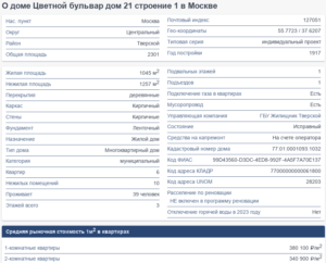 Сам дом расположен в лакомом для застройщиков месте — практически центр Москвы. Если смотреть по открытым данным, то в трёхэтажном здании общей площадью 2,3 тыс. кв.м осталось шесть квартир общей площадью 1045 кв. м и 1257 кв. м нежилых помещений. Дом, несмотря на все обращения жильцов, в карточке числится исправным, в программе реновации не числится и более того, на него собирают взносы на капремонт.